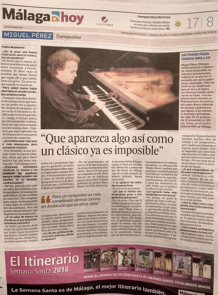 🇬🇧 English With more than seventy million cumulative streams across the major music platforms—Spotify, Amazon Music, among others—Miguel Pérez (Málaga, 1976) has established himself in recent years as one of the most widely recognised figures in contemporary minimalist neoclassical music. Among other recent milestones, his music has been selected on three occasions for Spotify’s prestigious Peaceful Piano playlist. His first contact with music took place in the Youth Wind Band of Miraflores and Gibraljaire Schools in Málaga, an ensemble to which he dedicated his earliest compositions, especially those written for Holy Week in Málaga, an area in which his work holds an important place. He later graduated from the Málaga Conservatory of Music, where he obtained qualifications as Professor of Solfège, Music Theory, Transposition and Accompaniment, as well as a Higher Degree in Tuba Performance. Since 1990, he has developed an intense compositional activity in a wide variety of formats, with works published and premiered internationally, encompassing music for radio, television, cinema and all kinds of productions. In parallel, he has released numerous recordings of his original output, with special attention to the music written for his instrument of choice: the piano. Based in the Canary Islands since 2007, and after more than thirty-six years fully devoted to composition and performance in its most personal sense, in 2023 he signed with the international label Snafu Records, based in Stockholm and currently responsible for the management of his entire catalogue online. He combines this new creative stage with his teaching work as Head of the Music Department at IES Santo Tomás de Aquino, on the island of Fuerteventura. More information at http://www.miguelperez.es ____________________________ 🇪🇸 Español Más de setenta millones de reproducciones acumuladas en las principales plataformas musicales —Spotify, Amazon Music, entre otras— avalan la inspiración de Miguel Pérez (Málaga, 1976), consolidado en los últimos años como una de las referencias más reconocidas de la música neoclásica minimalista contemporánea. Entre otros hitos recientes, destaca la selección de su música hasta en tres ocasiones para la prestigiosa playlist Peaceful Piano de Spotify. Su primer contacto con la música se produce en la Banda Juvenil de Música de los Colegios Miraflores y Gibraljaire de Málaga, agrupación a la que dedica sus primeras composiciones, especialmente las escritas para la Semana Santa de Málaga, ámbito en el que su obra ocupa un lugar fundamental. Posteriormente se gradúa en el Conservatorio Superior de Música de Málaga, donde obtiene los títulos de Profesor de Solfeo, Teoría de la Música, Transposición y Acompañamiento, y Profesor Superior de Tuba. Desde 1990 desarrolla una intensa labor compositiva en muy diversos formatos, con obras publicadas y estrenadas internacionalmente, abarcando música para radio, televisión, cine y todo tipo de espectáculos. Paralelamente, registra numerosas grabaciones de su producción original, con especial atención a la música escrita para su instrumento predilecto: el piano. Afincado en Canarias desde 2007, y tras más de treinta y seis años dedicados plenamente a la composición y la interpretación en su sentido más personal, en 2023 ficha por el sello internacional Snafu Records, con base en Estocolmo y actual gestor de todo su catálogo en la red, compaginando esta nueva etapa creativa con la labor docente que desempeña como Jefe del Departamento de Música del IES Santo Tomás de Aquino, en la isla de Fuerteventura. Más en http://www.miguelperez.es Ver todas las entradas de Miguel Pérez
