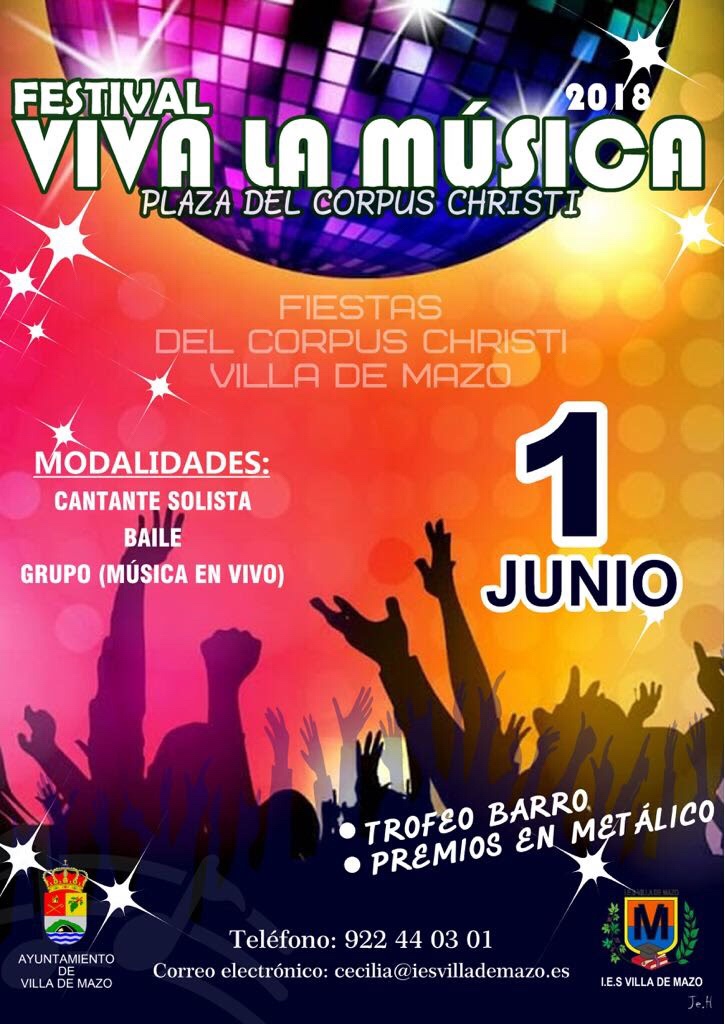 El próximo 1 de junio los ganadores de Majotalent 2018 representarán al IES Vigán en el festival interinsular Viva La Música de la isla de La Palma. Las voces de Nayara Acosta (Primer Premio Majotalent 2018), Paula Castillo (Segundo Premio Majotalent 2018), Oumou Jalloh (Tercer Premio Majotalent 2018), así como la bailarina Ana Díaz (Primer Premio Majotalent 2018) interpretarán respectivamente: Hallelujah (Leonard Cohen), Tuyo (Rodrigo Amarante), Je Vole (Michel Sardou), y por último un mix pregrabado de varios artistas que bailará Ana Díaz. Las voces estarán acompañadas a la percusión por Hugo Rodríguez (Profesor de Inglés del IES Vigán), y al piano por Miguel Pérez (Profesor de Música del IES Vigán). Mucha suerte.