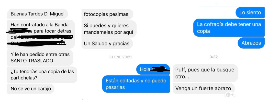 Cada año recibo tres o cuatro peticiones como esta desde todas partes del mundo. También se me “invita” a escribir marchas para tal imagen, también de favor. Amigos, al igual que no escribo sin ánimo de lucro si no es mi deseo, tampoco regalo las partituras de mi música, menos si están editadas. Quien no quiera tocar mi música, que no la toque. Gracias.