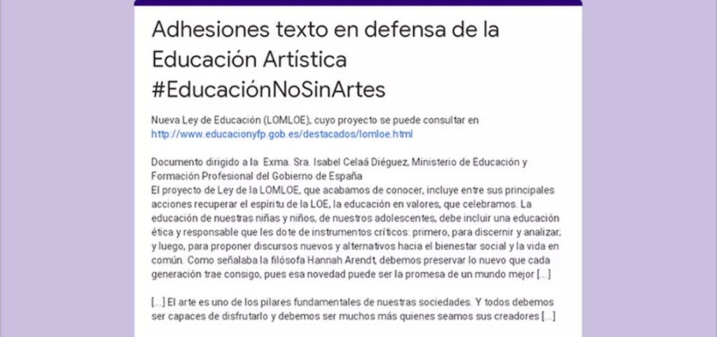 Toda persona que esté de acuerdo en que el gobierno debe reformular el proyecto de ley y dar cabida de manera justa a la educación artística en el currículum, por favor, que firme y comparta este formulario https://forms.gle/wMbDjr66XVL5YiRu5 #EducaciónNoSinArtes