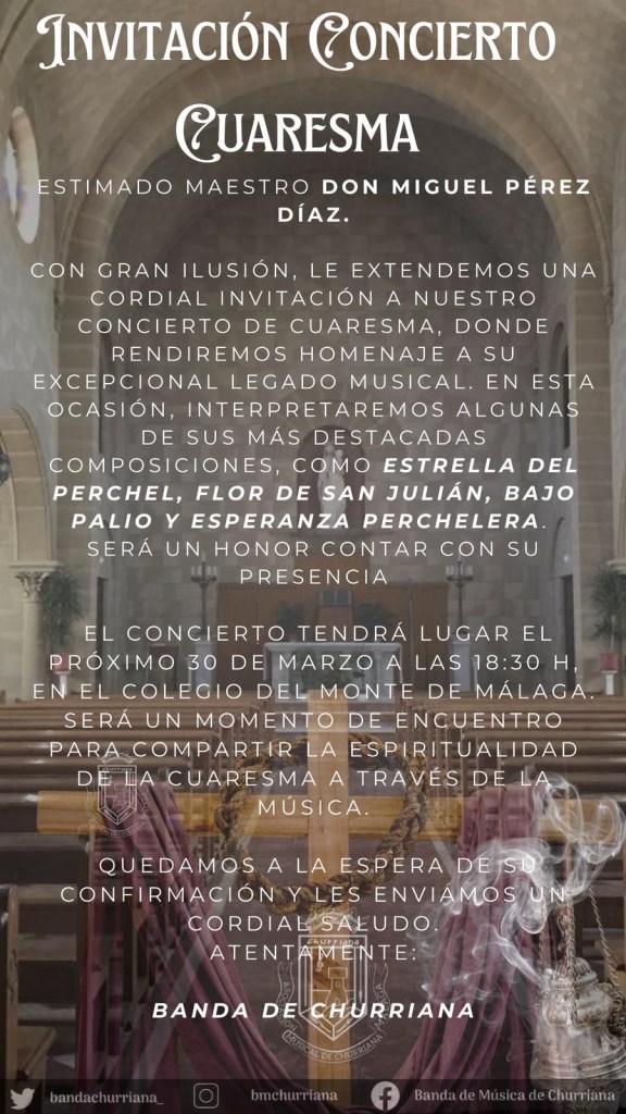 Recibo con mucha gratitud la invitación de la Banda de Música de Churriana para asistir a su concierto de Cuaresma, un evento en el que han querido rendirme un homenaje con un monográfico dedicado a mis composiciones.