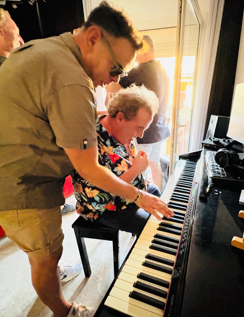 La fotografía detiene ese instante: yo, sentado al piano, mientras el maestro Molero, a mi lado, inclina su mano sobre las teclas. Un gesto sencillo que encierra todo lo que significa compartir música y amistad.
