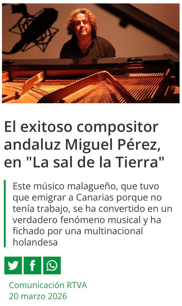 🇬🇧 English With more than seventy million cumulative streams across the major music platforms—Spotify, Amazon Music, among others—Miguel Pérez (Málaga, 1976) has established himself in recent years as one of the most widely recognised figures in contemporary minimalist neoclassical music. Among other recent milestones, his music has been selected on three occasions for Spotify’s prestigious Peaceful Piano playlist. His first contact with music took place in the Youth Wind Band of Miraflores and Gibraljaire Schools in Málaga, an ensemble to which he dedicated his earliest compositions, especially those written for Holy Week in Málaga, an area in which his work holds an important place. He later graduated from the Málaga Conservatory of Music, where he obtained qualifications as Professor of Solfège, Music Theory, Transposition and Accompaniment, as well as a Higher Degree in Tuba Performance. Since 1990, he has developed an intense compositional activity in a wide variety of formats, with works published and premiered internationally, encompassing music for radio, television, cinema and all kinds of productions. In parallel, he has released numerous recordings of his original output, with special attention to the music written for his instrument of choice: the piano. Based in the Canary Islands since 2007, and after more than thirty-six years fully devoted to composition and performance in its most personal sense, in 2023 he signed with the international label Snafu Records, based in Stockholm and currently responsible for the management of his entire catalogue online. He combines this new creative stage with his teaching work as Head of the Music Department at IES Santo Tomás de Aquino, on the island of Fuerteventura. More information at http://www.miguelperez.es ____________________________ 🇪🇸 Español Más de setenta millones de reproducciones acumuladas en las principales plataformas musicales —Spotify, Amazon Music, entre otras— avalan la inspiración de Miguel Pérez (Málaga, 1976), consolidado en los últimos años como una de las referencias más reconocidas de la música neoclásica minimalista contemporánea. Entre otros hitos recientes, destaca la selección de su música hasta en tres ocasiones para la prestigiosa playlist Peaceful Piano de Spotify. Su primer contacto con la música se produce en la Banda Juvenil de Música de los Colegios Miraflores y Gibraljaire de Málaga, agrupación a la que dedica sus primeras composiciones, especialmente las escritas para la Semana Santa de Málaga, ámbito en el que su obra ocupa un lugar fundamental. Posteriormente se gradúa en el Conservatorio Superior de Música de Málaga, donde obtiene los títulos de Profesor de Solfeo, Teoría de la Música, Transposición y Acompañamiento, y Profesor Superior de Tuba. Desde 1990 desarrolla una intensa labor compositiva en muy diversos formatos, con obras publicadas y estrenadas internacionalmente, abarcando música para radio, televisión, cine y todo tipo de espectáculos. Paralelamente, registra numerosas grabaciones de su producción original, con especial atención a la música escrita para su instrumento predilecto: el piano. Afincado en Canarias desde 2007, y tras más de treinta y seis años dedicados plenamente a la composición y la interpretación en su sentido más personal, en 2023 ficha por el sello internacional Snafu Records, con base en Estocolmo y actual gestor de todo su catálogo en la red, compaginando esta nueva etapa creativa con la labor docente que desempeña como Jefe del Departamento de Música del IES Santo Tomás de Aquino, en la isla de Fuerteventura. Más en http://www.miguelperez.es Ver todas las entradas de Miguel Pérez